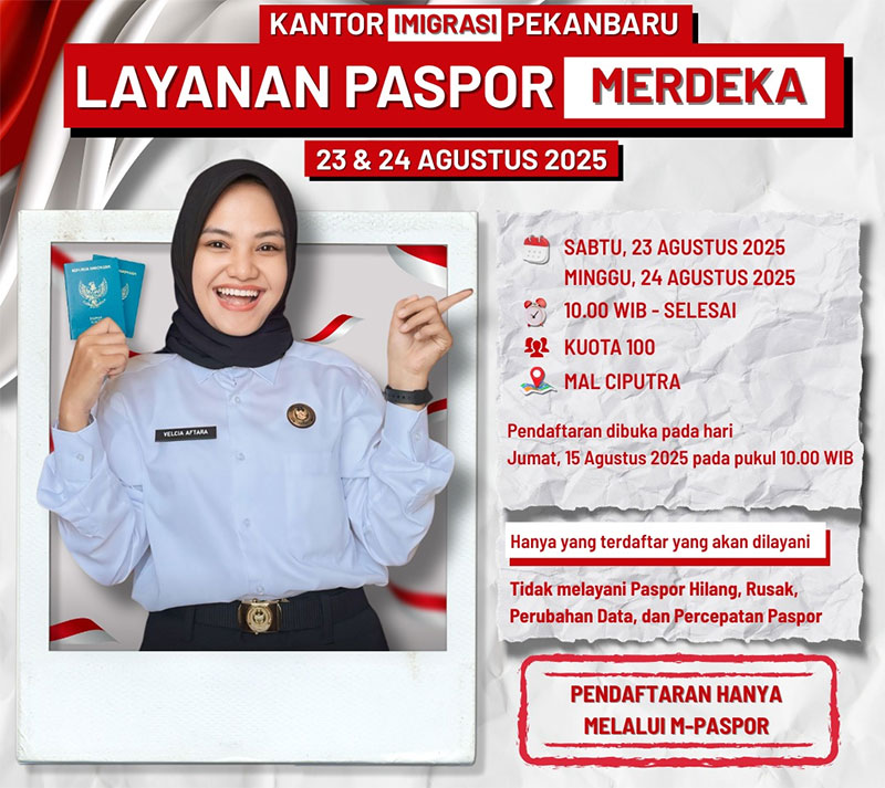 Pekanbaru (RiauNews.com) – Dengan semangat memperingati Hari Ulang Tahun ke-80 Kemerdekaan Republik Indonesia, Kantor Imigrasi Kelas I TPI Pekanbaru menghadirkan Layanan Paspor Merdeka di Mall Ciputra Seraya Pekanbaru pada tanggal 23–24 Agustus 2025.