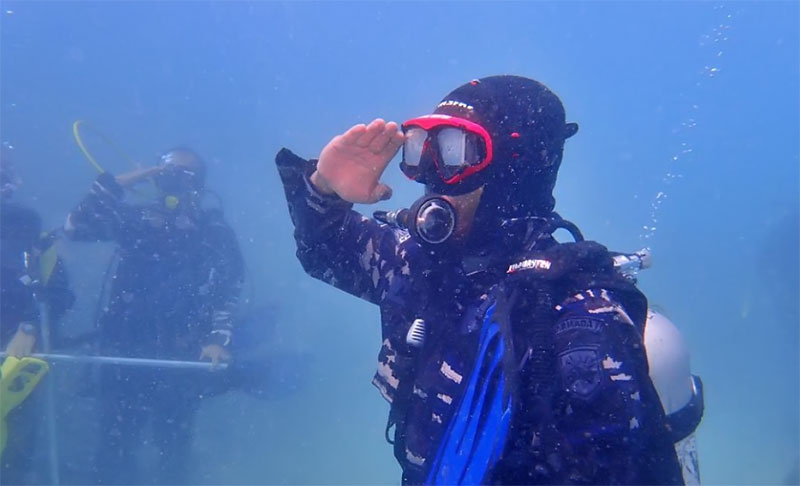 Prajurit penyelam Lanal Banten bersama personel gabungan dari TNI-Polri, Basarnas, BPBD, PSDKP, POSSI Provinsi Banten, Putera Puteri Maritim Indonesia, Pramuka Saka Bahari, dan komunitas penyelam melaksanakan pengibaran bendera dari kedalaman delapan meter. Mereka membawa bendera perlahan naik hingga berkibar di tiang permukaan laut, mengusung tema “Bersatu Berdaulat, Rakyat Sejahtera, Indonesia Maju.”