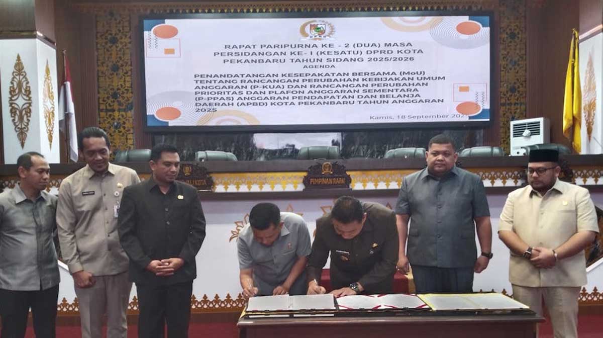 Pekanbaru (Riaunews.com) – DPRD bersama Pemerintah Kota (Pemko) Pekanbaru menyepakati Perubahan Kebijakan Umum Anggaran (P-KUA) dan Perubahan Prioritas Plafon Anggaran Sementara (P-PPAS) APBD 2025 dengan nilai Rp3,210 triliun. Kesepakatan tersebut ditandai dengan penandatanganan nota bersama dalam rapat paripurna di DPRD Pekanbaru, Kamis (18/9/2025) malam.