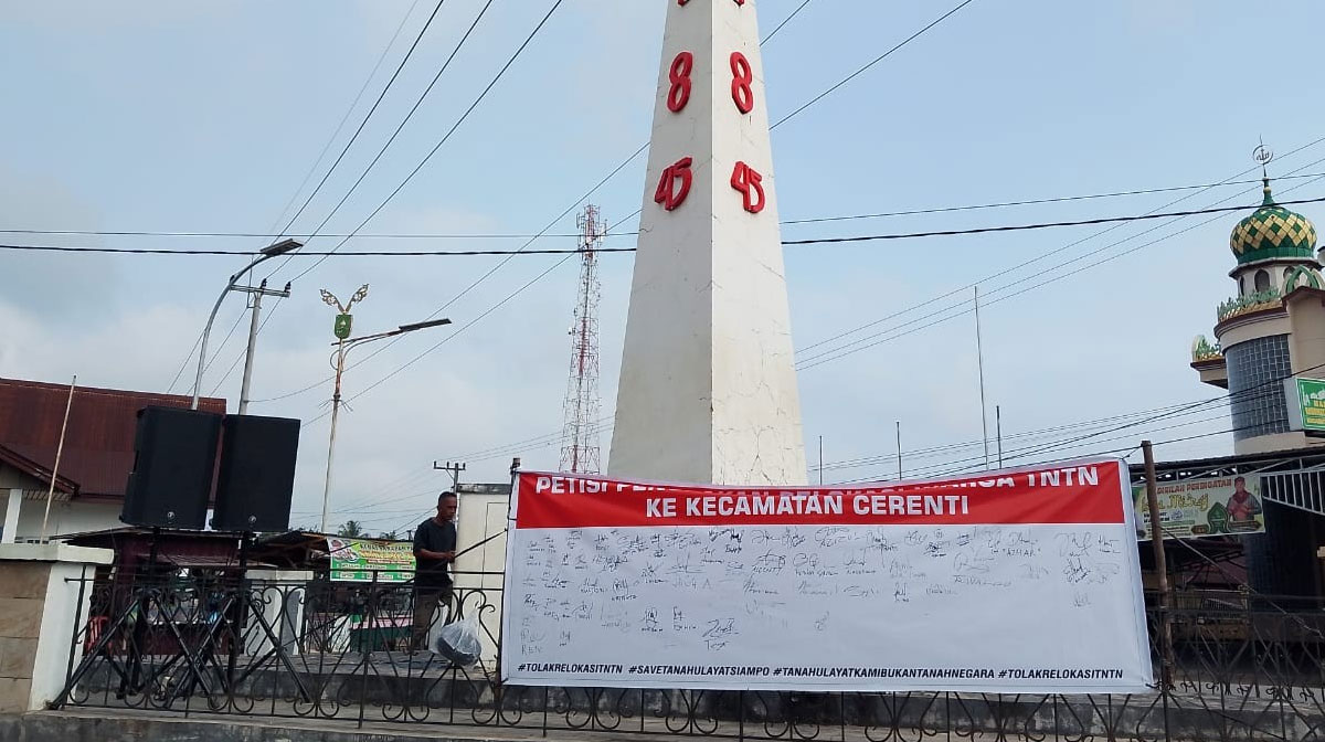 Informasi yang dihimpun di lapangan, pemasangan spanduk merupakan bagian dari rangkaian aksi damai warga Kecamatan Cerenti yang kembali digelar di Bundaran Tugu Proklamasi. Aksi ini menarik perhatian masyarakat sekitar dan menjadi simbol perlawanan terhadap kebijakan relokasi yang dinilai merugikan warga adat.