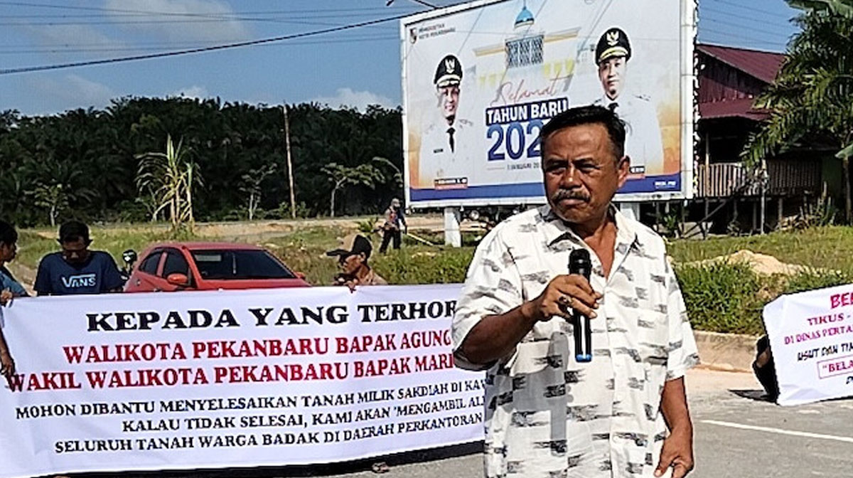 Pekanbaru (Riaunews.com) – Puluhan warga Badak, Kelurahan Tuah Negeri, Kecamatan Tenayan Raya, Kota Pekanbaru, menggelar aksi unjuk rasa di akses jalan pintu masuk menuju Perkantoran Wali Kota Pekanbaru, Senin (26/1/2026). Aksi tersebut menuntut Pemerintah Kota Pekanbaru segera merealisasikan ganti rugi tanah milik almarhumah Sakdiah yang hingga kini belum diselesaikan.