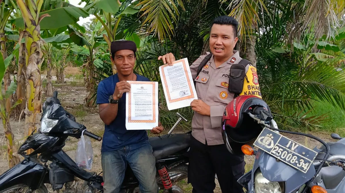 Dalam kegiatan itu, Bhabinkamtibmas Kelurahan Bangko Kanan Aipda Mhd. Rifai Hrp turun langsung menyambangi warga menggunakan sepeda motor dinas roda dua. Ia menyampaikan imbauan secara humanis sekaligus menyebarluaskan Maklumat Kapolda Riau terkait larangan pembakaran lahan.