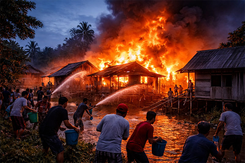 Inhil (RiauNews.com) – Kebakaran besar terjadi di kawasan permukiman padat penduduk Dusun Pasar Lama, Desa Simpang Gaung, Kecamatan Gaung, Kabupaten Indragiri Hilir, Selasa pagi (24/02/2026), sekitar pukul 05.30 WIB. Peristiwa tersebut mengakibatkan sedikitnya 14 unit rumah warga yang mayoritas berbahan kayu dan semi permanen ludes dilalap api.