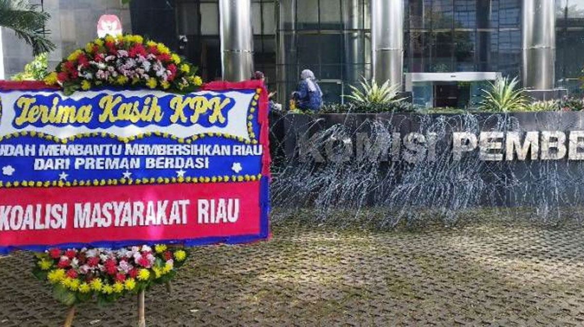 Ada pula karangan bunga dengan tulisan “Kami Bersama KPK Terus Bersih-bersih Riau Dari Korupsi” yang dikirim oleh Ikatan Keluarga Riau.