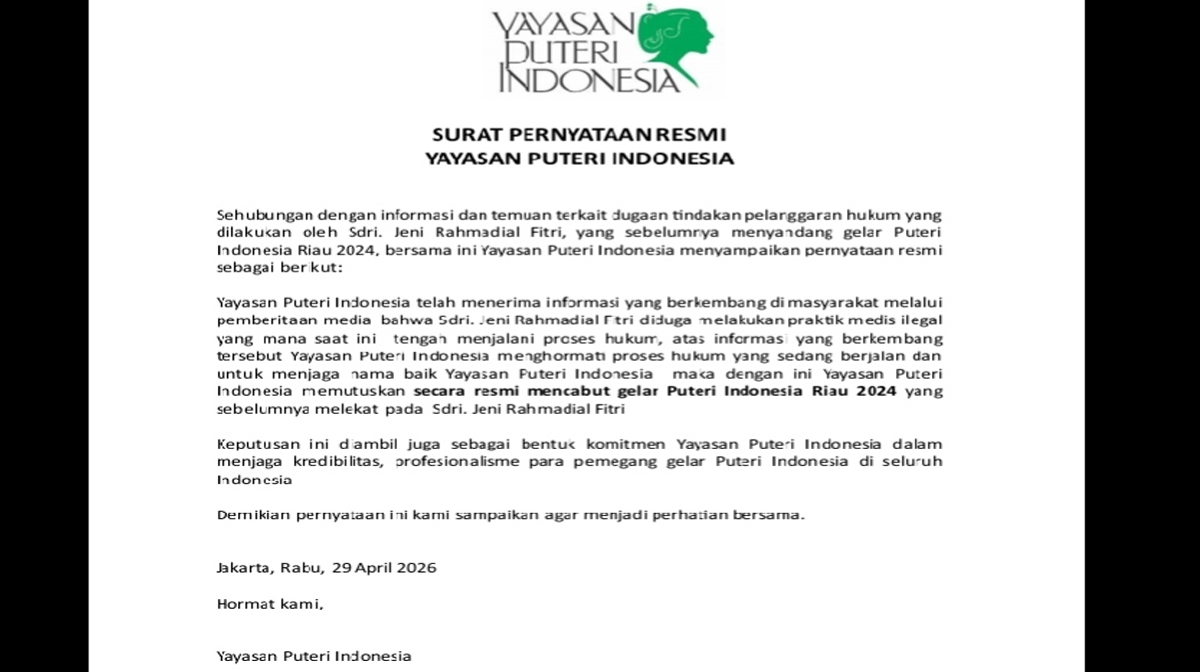“Yayasan Puteri Indonesia menghormati proses hukum yang sedang berjalan,” demikian pernyataan yang disampaikan, Rabu (29/4/2026).